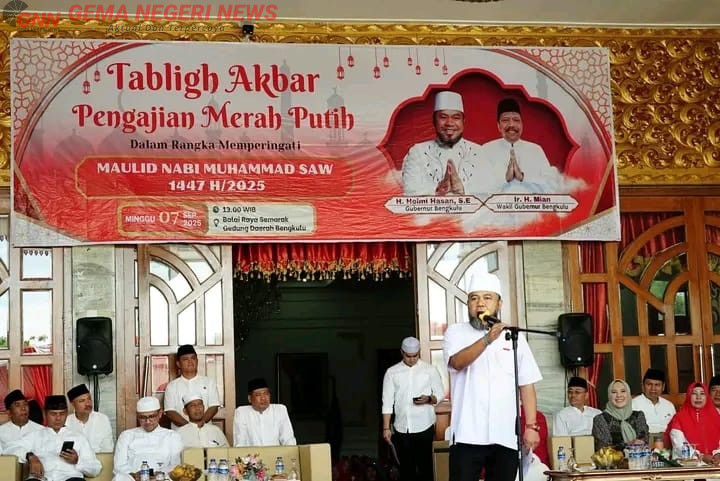 BENGKULU (GemaNegeri.com) – Ribuan jamaah memadati Balai Raya Semarak Bengkulu pada acara Tabligh Akbar Pengajian Merah Putih, Ahad (7/9). Kegiatan ini digelar dalam rangka memperingati Maulid Nabi Muhammad shallallahu ‘alaihi wa sallam 1447 H/2025 M.