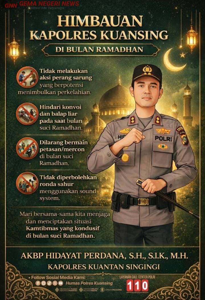 TELUK KUANTAN (GemaNegeri.com)– Guna memastikan situasi yang kondusif dan aman selama bulan suci Ramadhan, Kapolres Kuantan Singingi (Kuansing), AKBP Hidayat Perdana, S.H., S.I.K., M.H., secara resmi mengeluarkan maklumat himbauan kepada seluruh lapisan masyarakat.