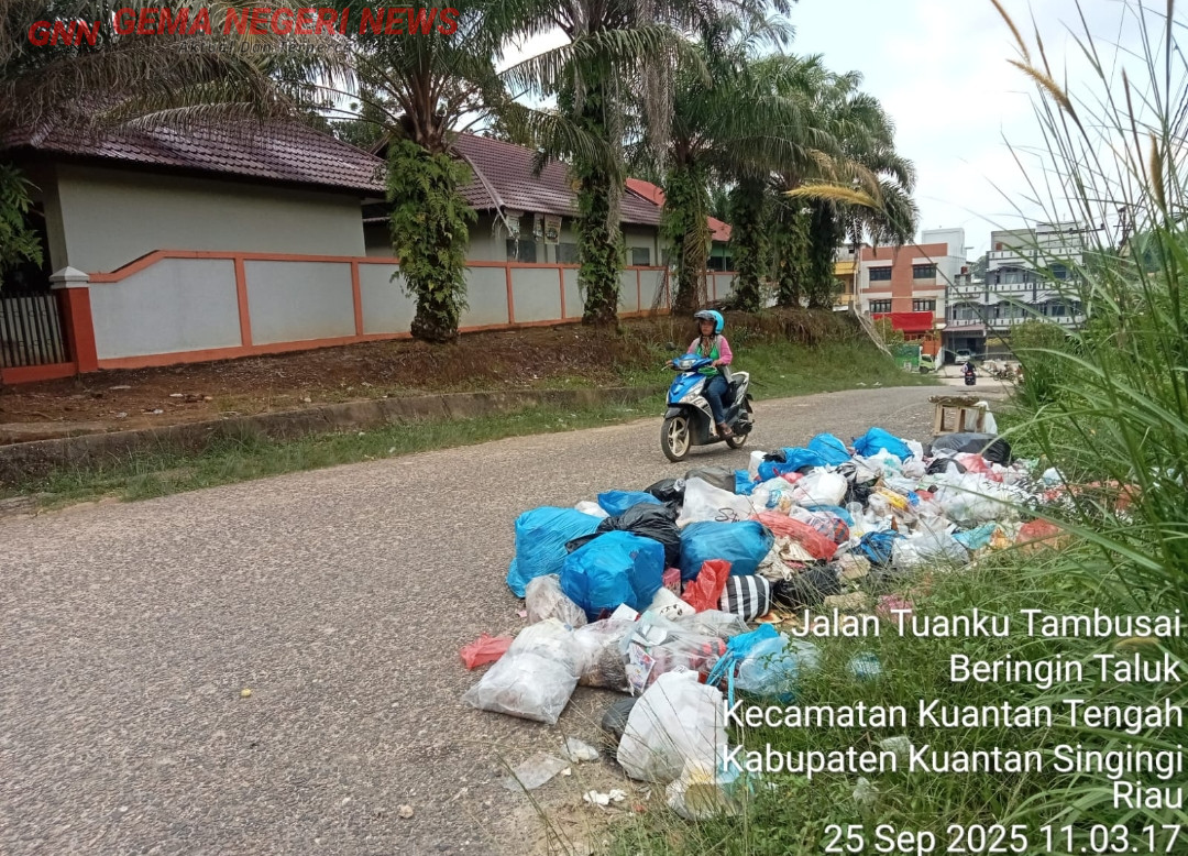 TELUK KUANTAN (GemaNegeri.com) – Di bawah terik matahari siang, tumpukan kantong plastik berwarna-warni memenuhi sisi Jalan Tuanku Tambusai, tepat di gang masuk SMP Negeri 2 Teluk Kuantan. Sampah rumah tangga yang dibiarkan menumpuk itu tampak jelas bagi siapa saja yang melintas, termasuk para siswa yang hendak masuk sekolah.
