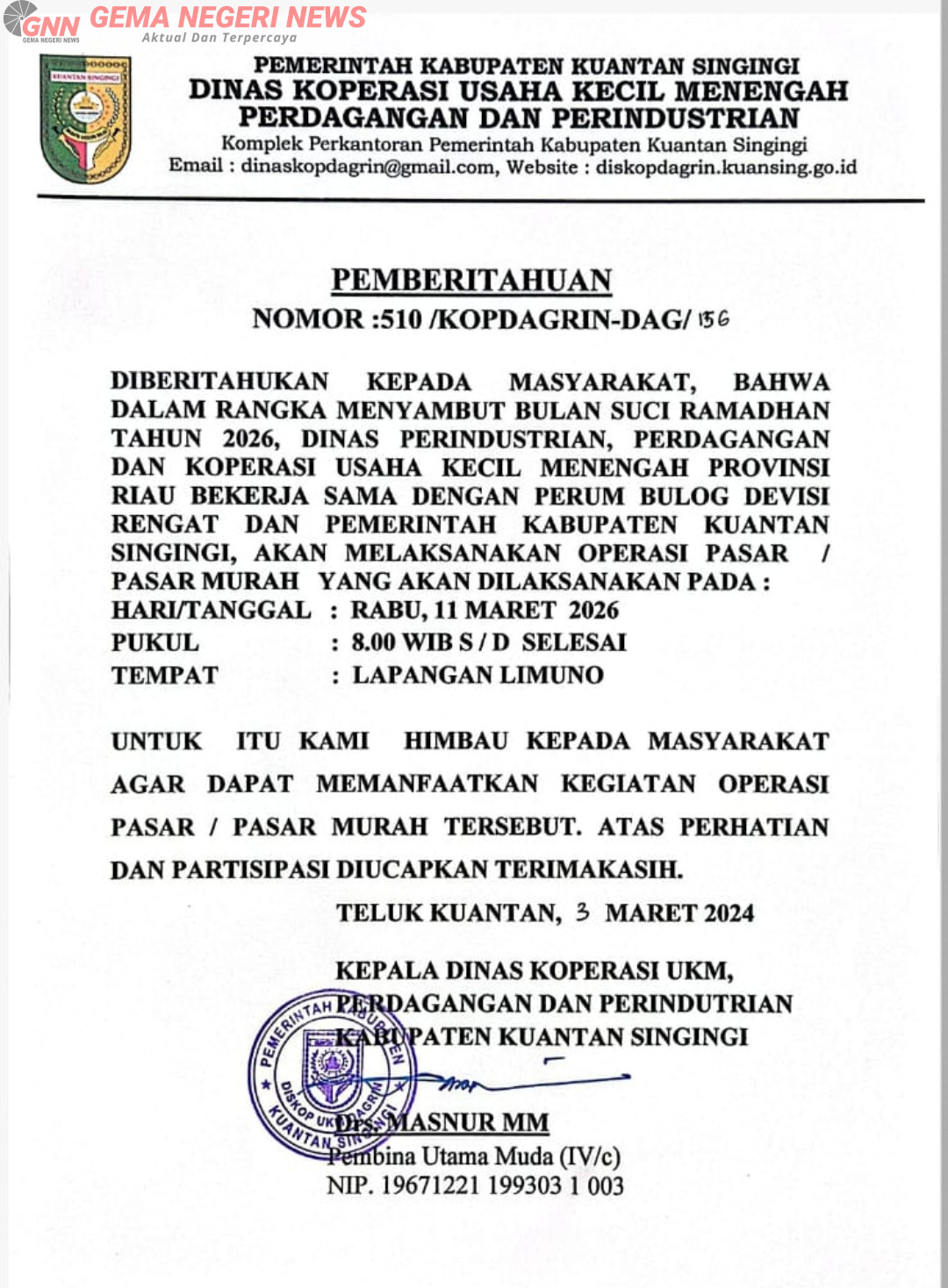 KUANTAN SINGINGI (GemaNegeri.com) – Kepala Dinas Koperasi UKM, Perdagangan dan Perindustrian Kabupaten Kuantan Singingi, Drs. Masnur, MM, membeberkan sejumlah informasi terkait pelaksanaan Operasi Pasar Murah Ramadan 2026 yang akan digelar di Kecamatan Kuantan Tengah.