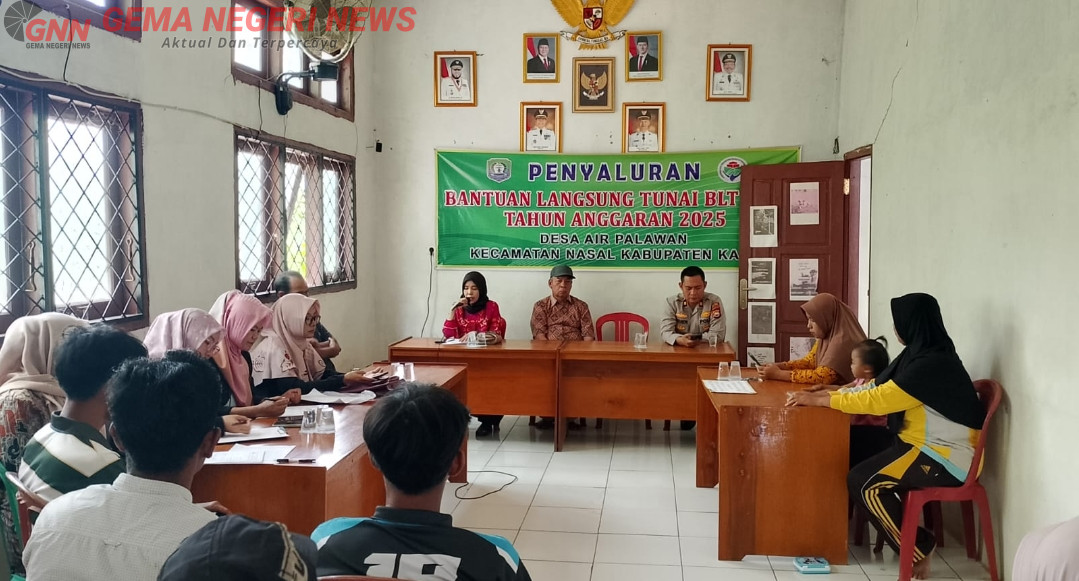 KAUR (GemaNegeri.com) – Pemerintah Desa Air Palawan, Kecamatan Nasal, Kabupaten Kaur, menyalurkan Bantuan Langsung Tunai (BLT) Dana Desa (DD) untuk triwulan ketiga tahun 2025. Kegiatan ini berlangsung di Gedung Serba Guna Desa Air Palawan, Rabu (5/11/2025).