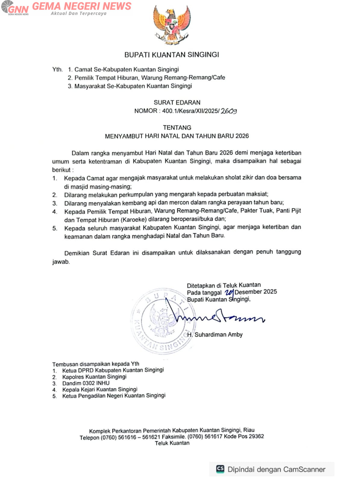 TELUK KUANTAN (GemaNegeri.com) – Dalam rangka menjaga ketertiban umum dan ketenteraman masyarakat menjelang perayaan Natal 2025 dan Tahun Baru 2026, Bupati Kuantan Singingi (Kuansing), H. Suhardiman Amby, resmi mengeluarkan Surat Edaran (SE) Nomor: 400.1/Kesra/XII/2025/2609.