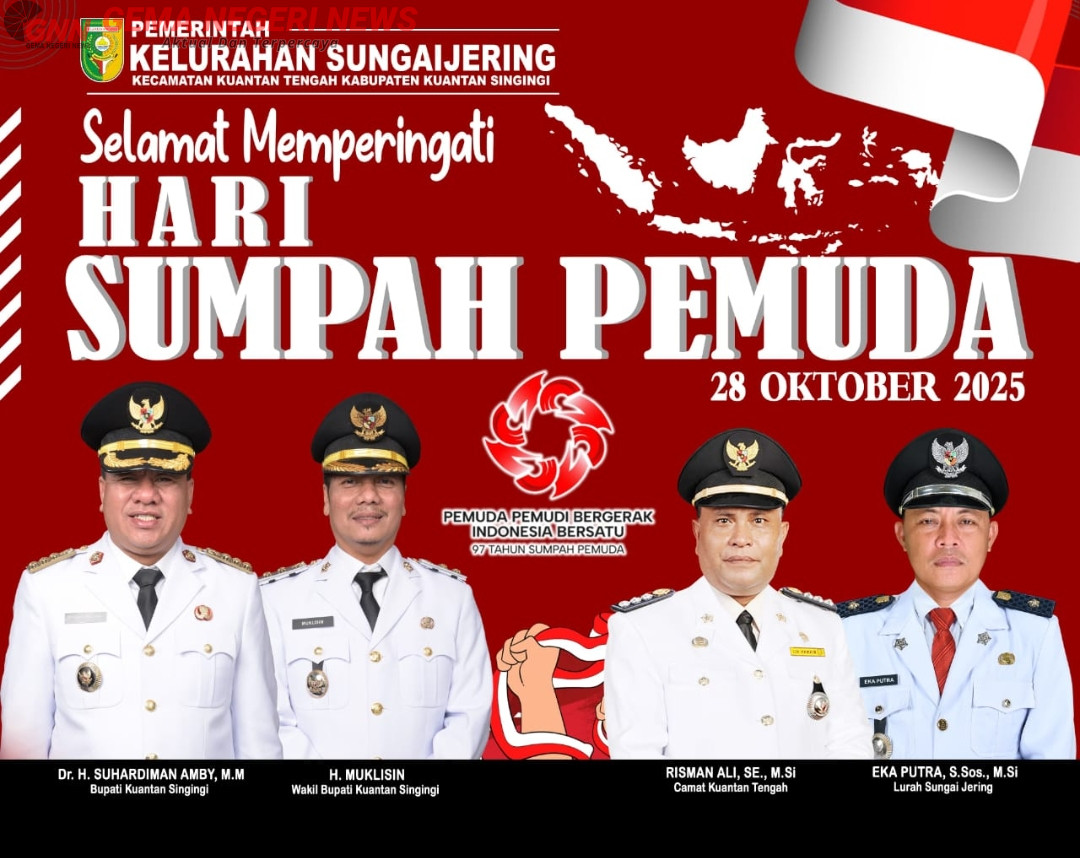 KUANTAN TENGAH (GemaNegeri.com) – Pemerintah Kelurahan Sungai Jering, Kecamatan Kuantan Tengah, Kabupaten Kuantan Singingi (Kuansing), memperingati Hari Sumpah Pemuda ke-97, Selasa (28/10/2025), dengan semangat kebersamaan dan ajakan kepada generasi muda untuk terus berkontribusi dalam pembangunan daerah.